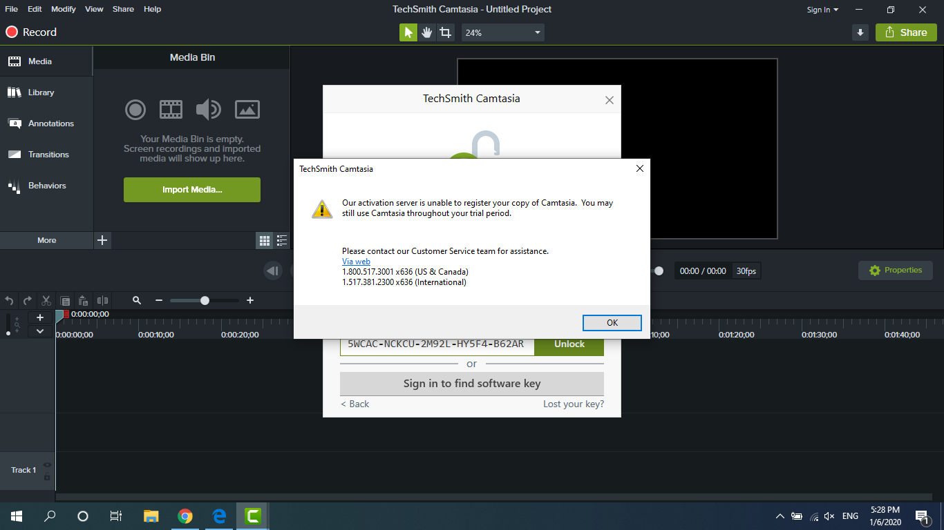 Bước 3: Mở CAMTASIA, điền Key bản quyền vào và sử dụng: 5WCAC-NCKCU-2M92L-HY5F4-B62AR