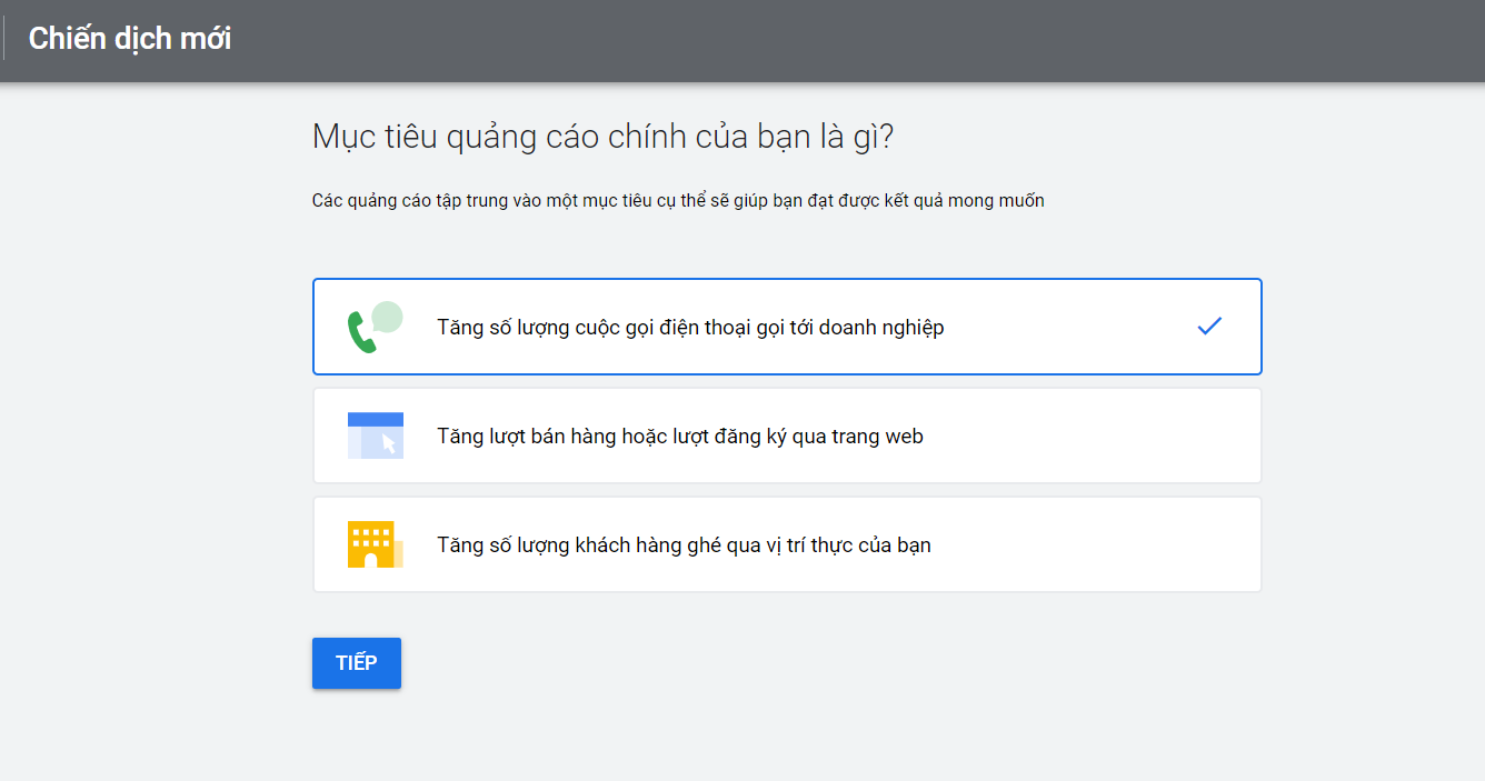 Sau khi nhấp đăng ký thì bạn có thể chọn mục đích quảng cáo của bạn, bạn có thẻ chọn tùy thích 1 trong 3 cái dưới tại bước này cũng không quan trọng cho lắm, sau này nếu như muốn thì bạn có thể chỉnh sửa lại trước khi lên chiến dịch quảng cáo.