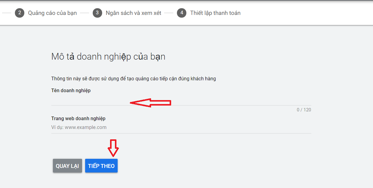 Tiếp theo bạn nhập tên Doanh nghiệp của bạn rồi chọn Tiếp theo
