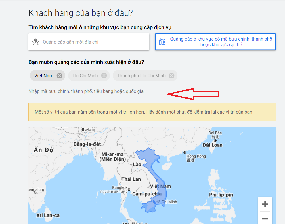 Ngay bước chọn khu vực, bạn sẽ chọn nơi mà bạn nhắm đến đối tượng khách hàng mà bạn muốn tiếp cận, muốn video youtube của mình được được họ xem. Ví dụ ở dưới mình chọn khu vực Hồ Chí Minh, Việt Nam chẳng hạn.