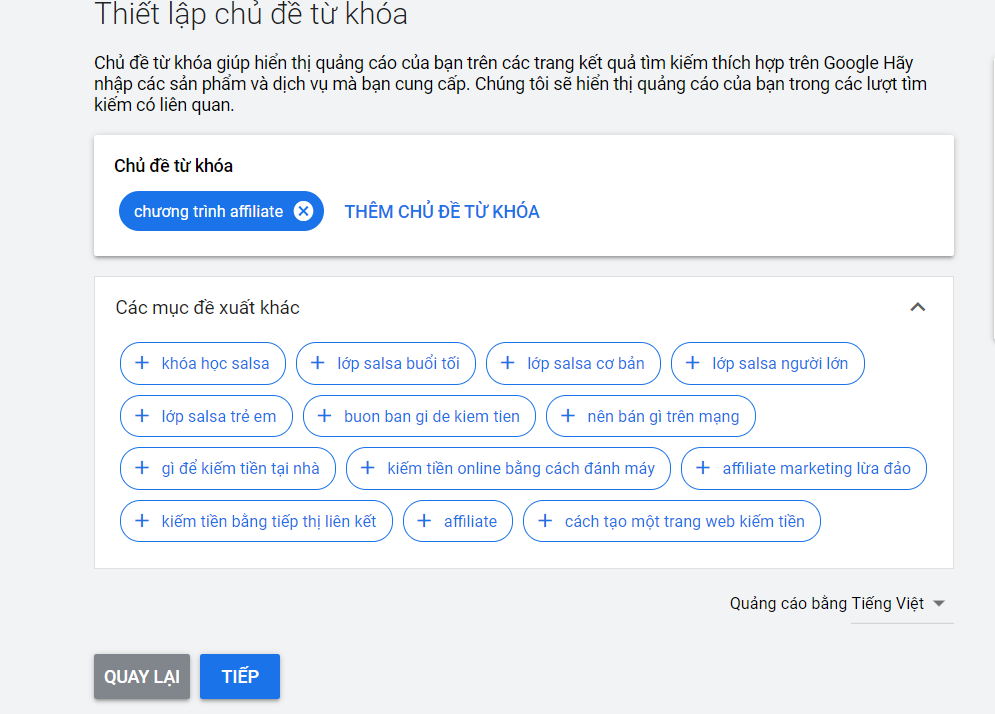 Tiếp theo bạn chọn từ khóa cho video của bạn, lưu ý là những bước này bạn không cần phải lăng tăng nên chọn từ khóa nào, bạn chỉ cần chọn ngẫu nhiên rồi sau này bạn sẽ sửa lại sau.