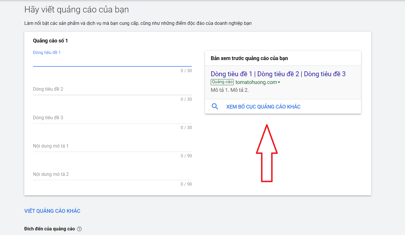 Lần lượt điền hết tiêu đề vào những mục người ta yêu cầu bạn điền, tiêu đề quảng cáo của bạn sẽ xuất hiện như những gì mà bạn điền vào bên góc phải.
