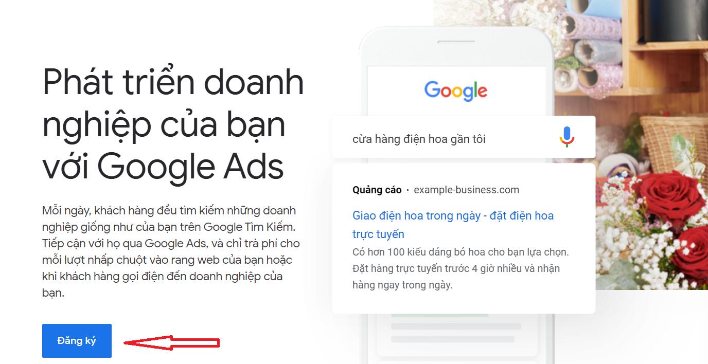 Bước thứ 2: Các bạn tiến hành đăng ký cho mình một tài khoản quảng cáo bằng cách nhấp vào nút Đăng ký như trên hình