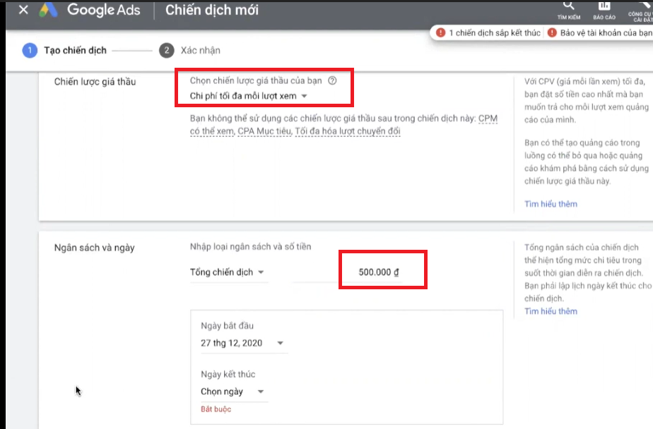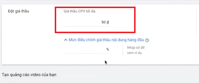 Chi phí giá thầu là tối đa là 50đ, lưu ý là ngày đầu tiên chạy thì mức giá thầu có thể là 30-40đ, do đó hàng ngày bạn nên vào chiến dịch này và chỉnh giá thầu tối đa cho thấp dần thấp dần cho tới khi chi phí trên mỗi view là 10đ thì thôi.