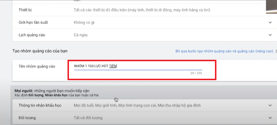 Sau đó bạn đặt tên cho nhóm quảng cáo của mình, lưu ý là những bước trên bạn có thể cho qua và để mặc định như người ta đã điền trước cho bạn là được.