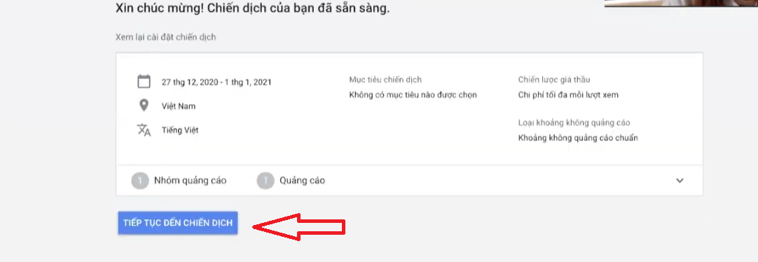 Sau khi điền xong hết những thông tin đó thì bạn sẽ được chuyển đến một trang mới, nhấn Tiếp tục với chiến dịch là bạn đã hoàn thành xong chiến dịch quảng cáo của mình với mức chi phí chỉ 10đ/view.