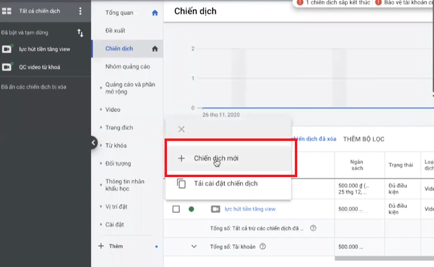 Đăng nhập vào Google ads, sau đó bạn chọn Tạo một chiến dịch mới